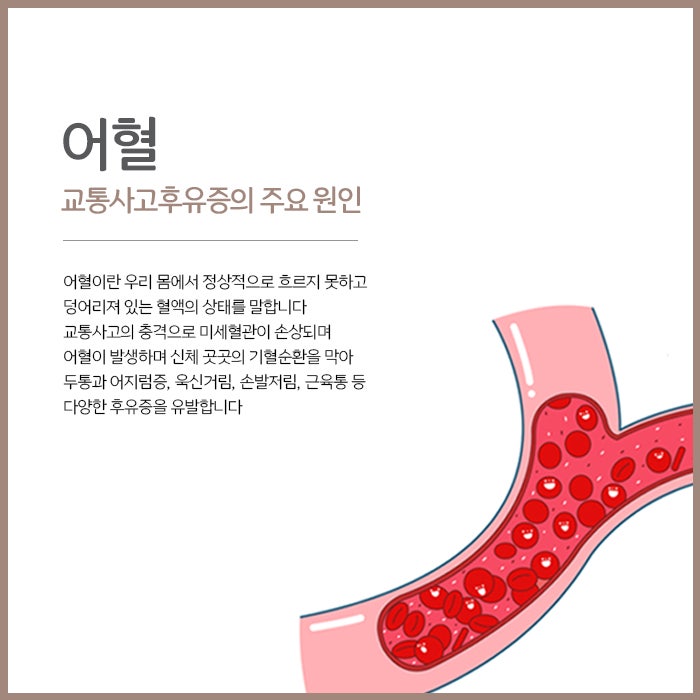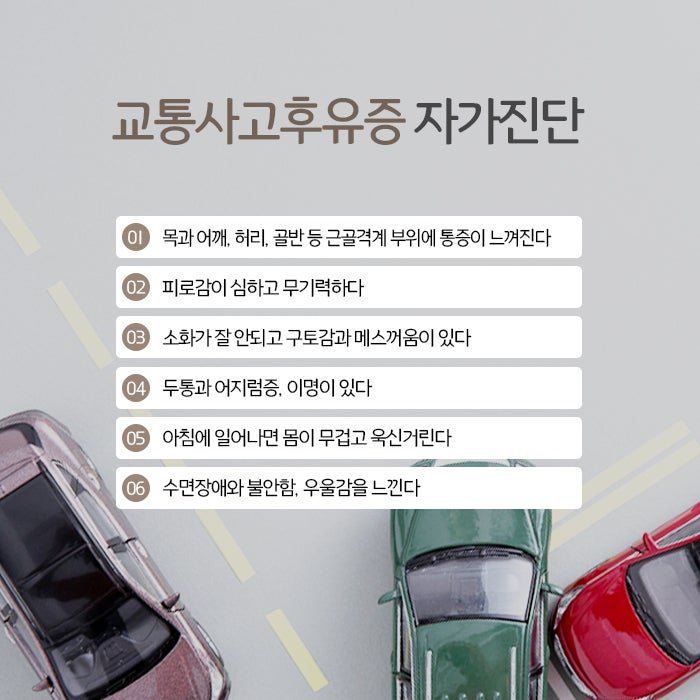 안전벨트를 잘 착용하고 있었다고 해도 목 주변은 단단히 고정되지 않는데요. 그래서 교통사고가 나면 그 충격으로 목이 앞뒤로 크게 젖혀지거나 좌우로 쏠리면서 경추라인이 손상되기 쉽습니다. 이에 교통사고후유증으로 목통증과 뒷목결림, 어깨통증이 발생하게 되고, 척추라인을 따라 손상이 번지면서 등과 허리통증, 어깨결림 등 근골격계 증상이 이어지기도 합니다. 교통사고후유증은 근골격계와 관련된 증상 외, 다양한 증상으로 나타나곤 합니다. 신체 내부 보이지 않는 장기와 신경 등 조직이 다쳐서 소화불량과 메스꺼옴, 구토, 생리통, 두통, 현기증, 만성피로감, 손발저림 증상이 나타납니다. 또한 심리적으로도 불안정해지면서 우울감과 불안함, 수면장애를 호소하는 환자도 적지 않아요.