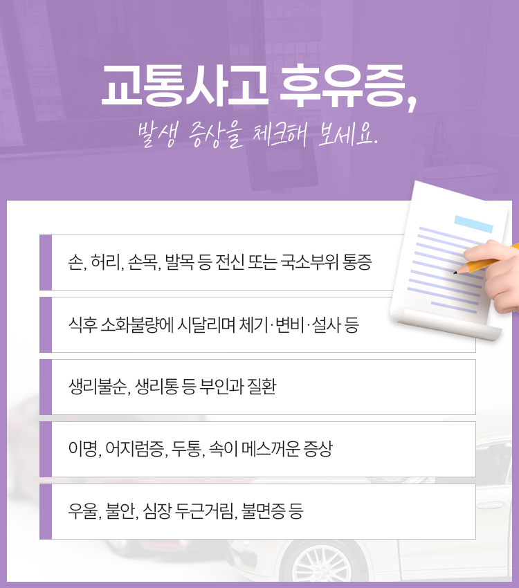교통사고 후유증의 특징은 사고 직후에는 증상이 없거나 미미하다가 시간이 지나면서 점차 심해지는 경우가 많다는 것입니다.