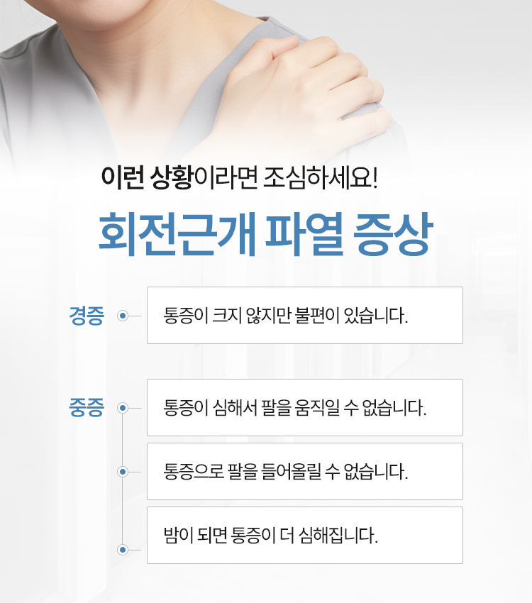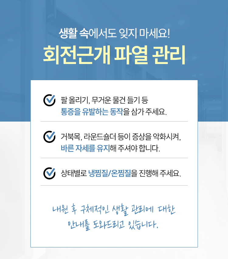 회전근개가 파열되어 회복이 필요한 상황 속에서는 환자분 스스로 통증을 유발하는 동작을 삼가려는 노력이 중요하다고 하겠습니다. 이미 손상을 입은 힘줄은 사소한 자극에도 추가적인 파열이 발생할 수 있으므로 무거운 물건을 들거나 팔을 어깨 높이 이상으로 무리하게 들어 올리는 행위는 자제되어야 하며 통증 양상을 고려하여 통증이 느껴지지 않는 범위 내에서 조심스럽게 움직여 주시기를 바랍니다. 이런 노력을 기울여 주어야 보다 안정적인 회복 효과를 기대해 보실 수 있을 것입니다. 감사합니다.