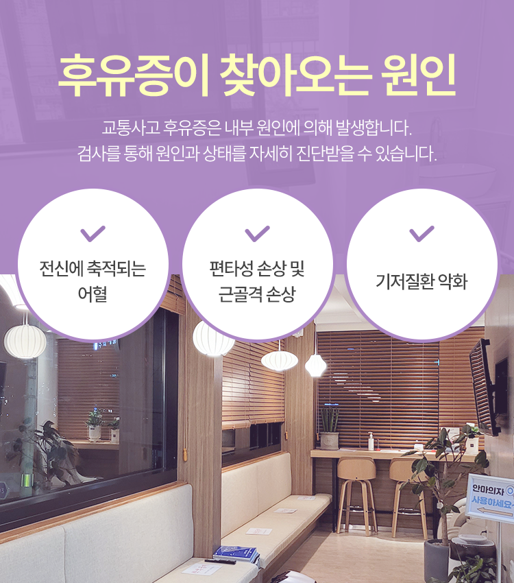 사고의 충격은 신체 내부 혈관에도 손상을 입히게 되는데요. 이로 인해 혈액이 정상적인 통로를 벗어나게끔 만들고는 합니다. 이 상황 속에서 발생하는 변질된 혈액은 노폐물이 되어 어혈이라는 이름으로 다루어지게 됩니다. 어혈은 체내 혈류 순환을 훼방 놓는 원인으로 작용하게 되면서 다양한 후유증을 유발합니다.